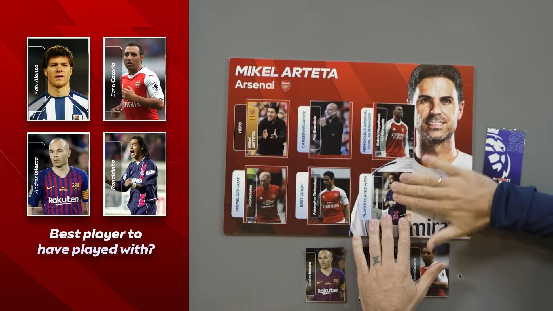 近日,阿森纳主帅阿尔特塔参加了天空体育的贴纸册挑战,选择了他职业生涯中影响最大的人、他执教阿森纳期间最难忘的一个进球、他心中英超最强的中场、他认为最精彩的德比,以及他踢球时期遇到的最强队友。