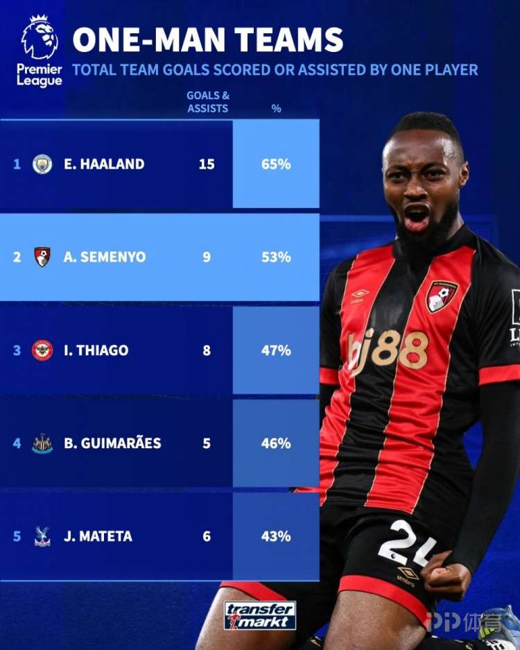 哈兰德参与全队65%进球英超居首 塞梅尼奥53%排第二